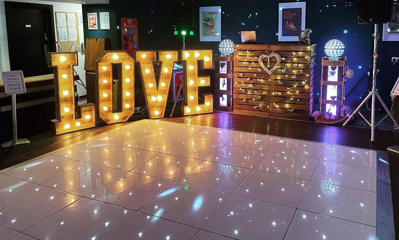 This is paired with matching lighting pedestals to create a disco setup which will match the styling of your special day.